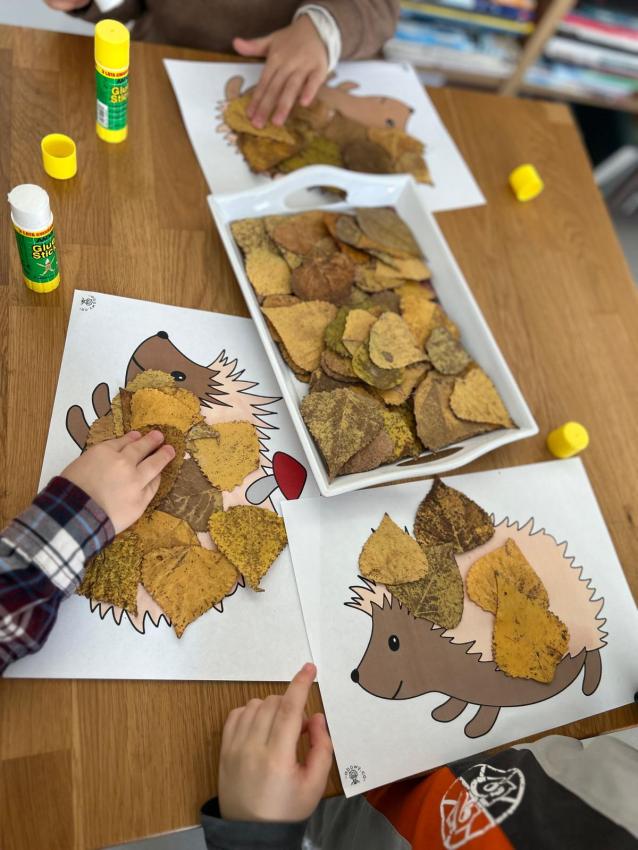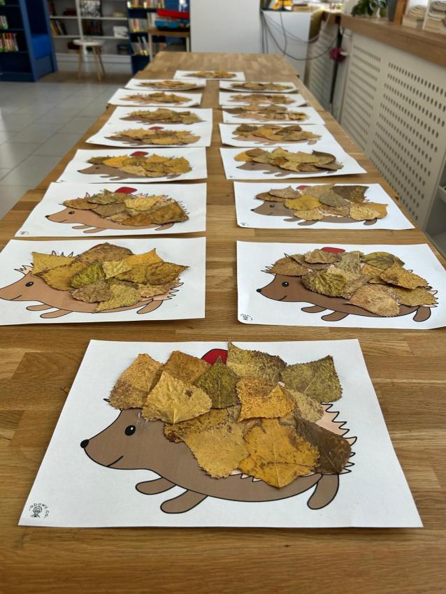 Podczas spotkania wysłuchały opowiadania o nieśmiałym jeżu, a następnie z wielkim zaangażowaniem wykonały własne jeże z liści.